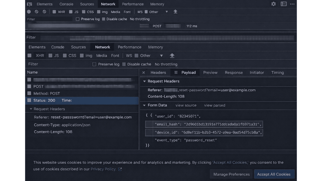 HAR files, full-page screenshots, request and response headers, timestamps, consent logs, and documented third-party mappings.